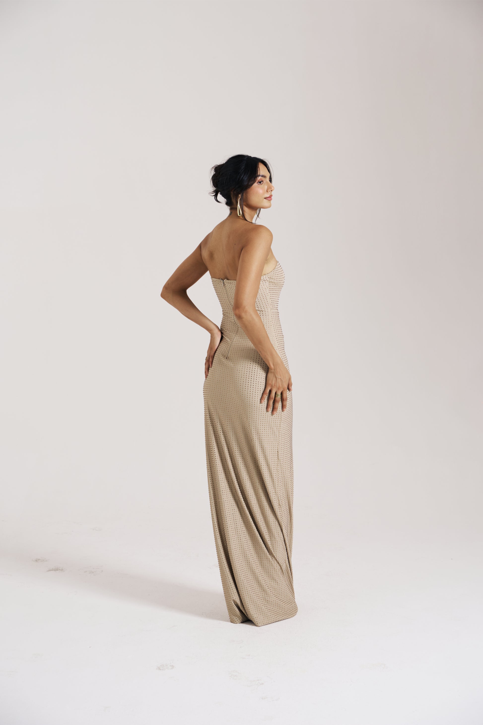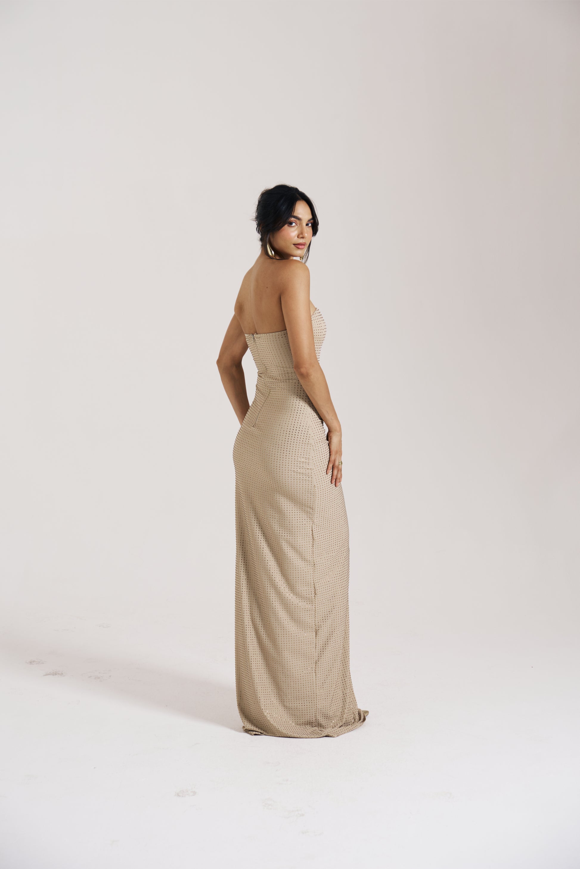A strapless fitted gown designed with rhinestone embellishments that create a subtle shimmering texture across the surface. The neckline features a softly sculpted shape that frames the upper body while maintaining a clean silhouette.The body-contouring fit flows into a long maxi length, creating an elongated look. A centre back zip closure ensures a secure and structured fit.
