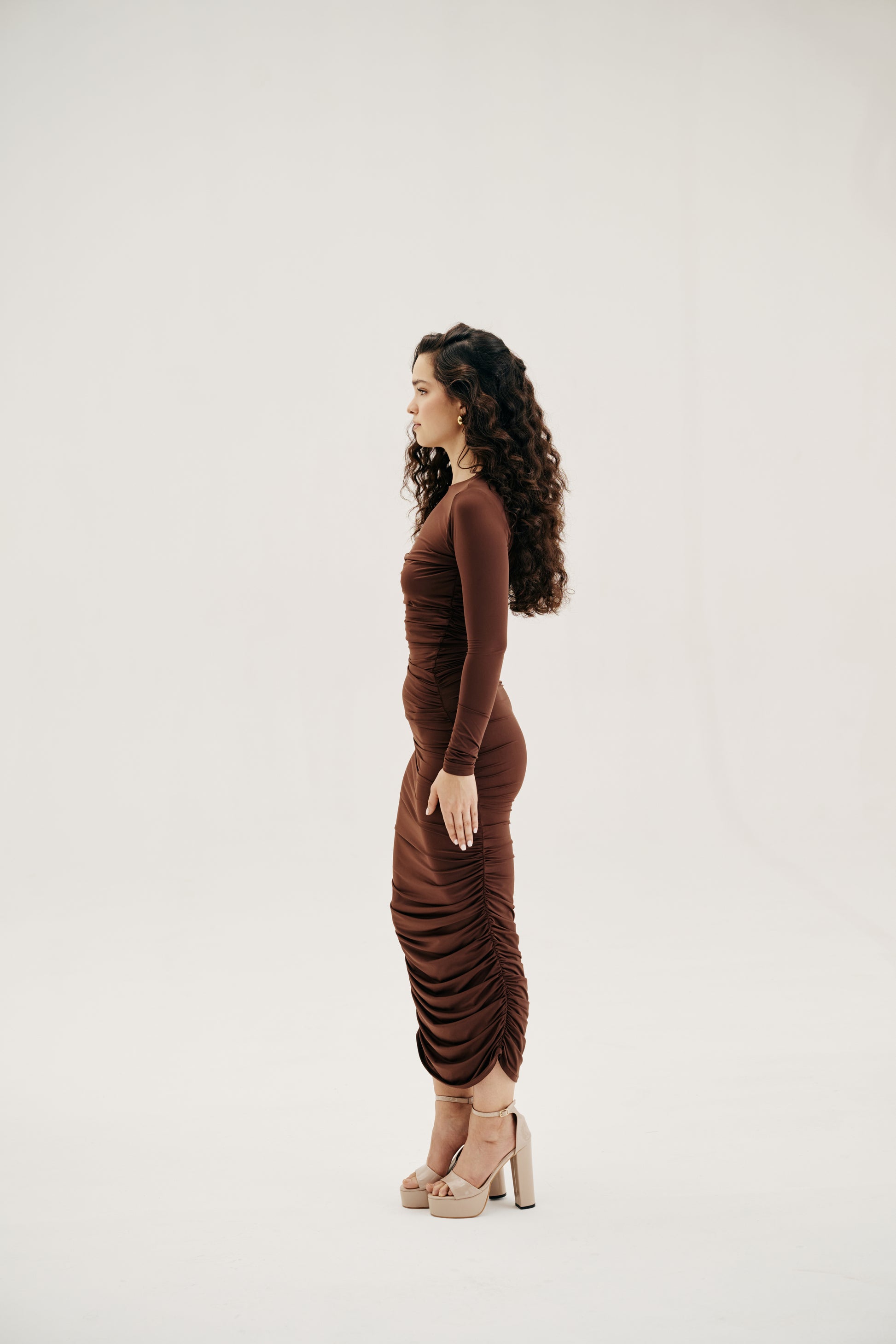 This full-sleeve gathered bodycon dress is all about sculpted simplicity. The gathered ruching along the body lends a flattering, elongated silhouette. Strong yet soft — a grounded choice for transitional dressing.