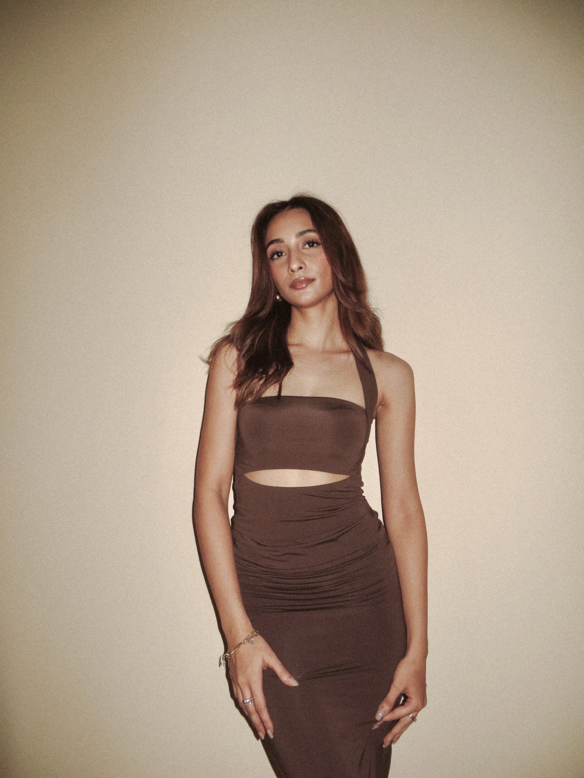 Sculpted and confident, this full-length dress features a bold cutout detail at the front with side ruching that hugs and lifts. The high slit opens up cleanly to create elongation through the leg. Designed to hold shape and flatter from every angle, this one transitions seamlessly from resort wear to nights out.